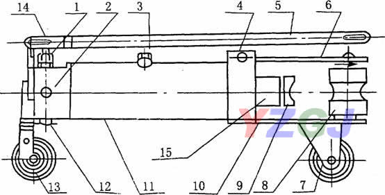 11、油箱;12、滤油器;13、前轮:14、手柄座;15、作用杆;
